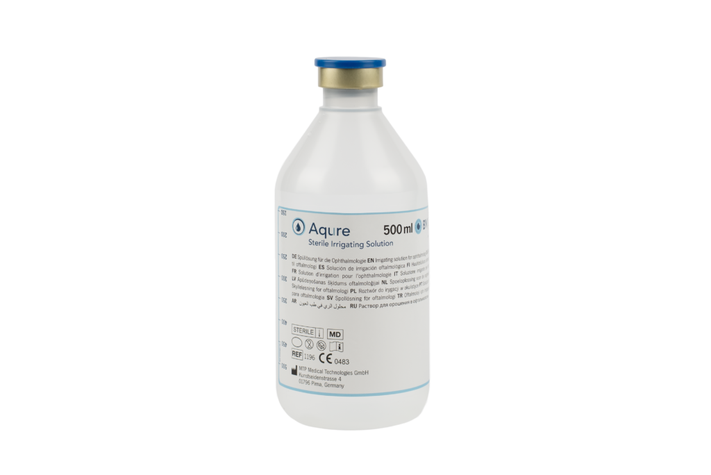 Aqure™ 20 ml (kunststof flesje) en Aqure™ 500 ml (verkrijgbaar in glazen of kunststof flessen) zijn steriele, fysiologische spoeloplossingen voor oftalmologische toepassingen. Ze zijn bestemd voor irrigatie van de voorste oogkamer tijdens cataractchirurgie, evenals voor andere intraoculaire of extraoculaire ingrepen, waaronder therapeutische of diagnostische toepassingen waarbij irrigatie of het behoud van vocht vereist is.